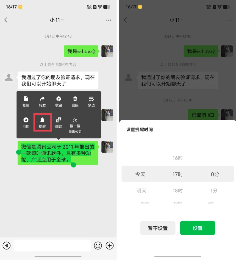 长按某条消息(如“明天下午3点开会”)→ 点“提醒” → 设置具体时间